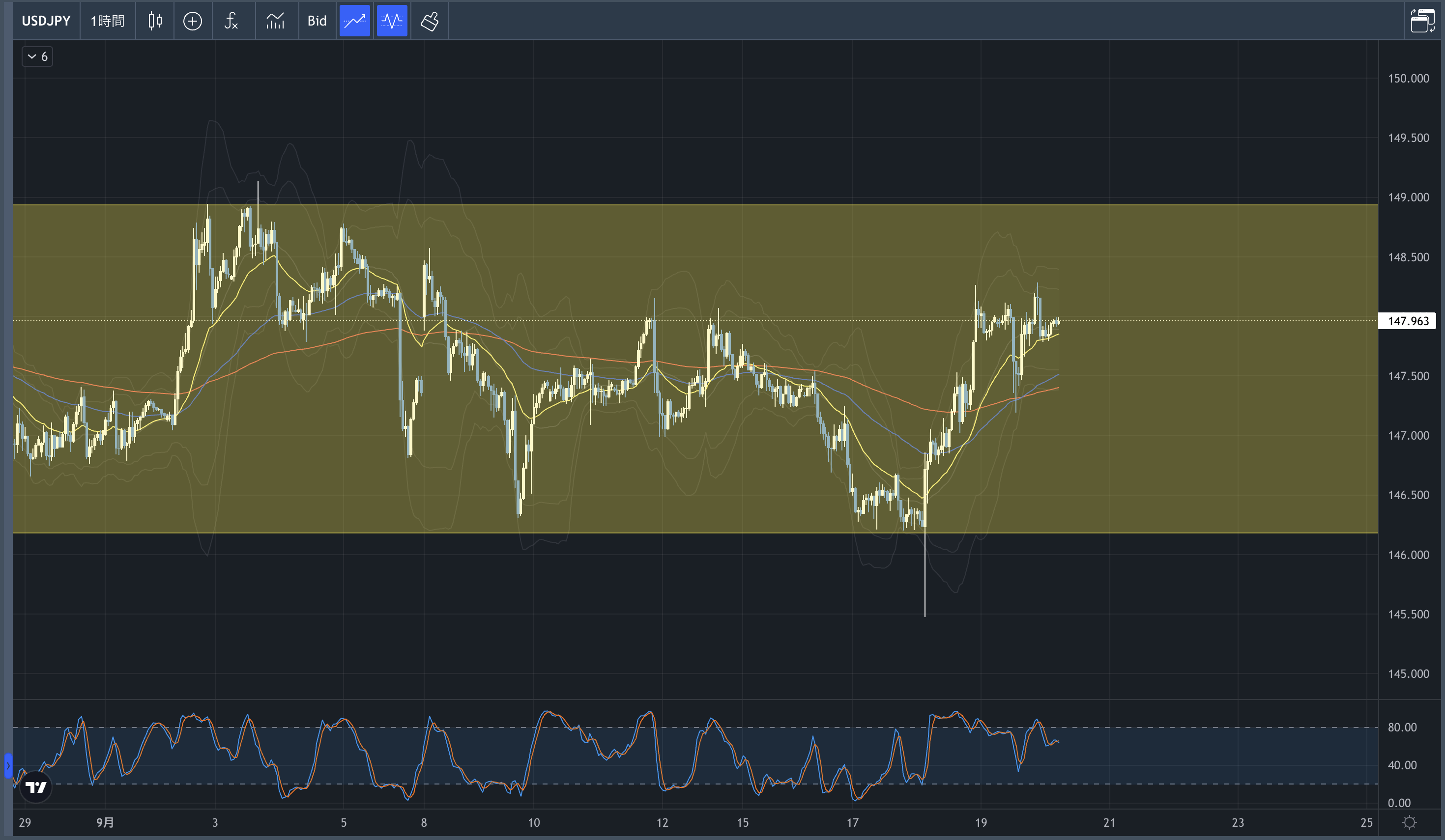 4時間足でも1時間足でも147.50あたりで移動平均線をサポートとして反発しそうなので、そのあたりでロングしてみようかなと思っています。