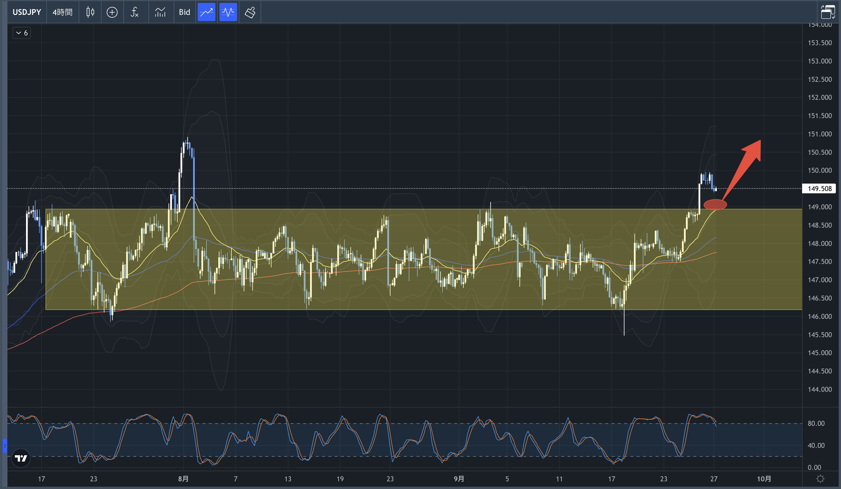 まずは教科書通り、レジサポ転換読みで149円前半でロングしようと思います。