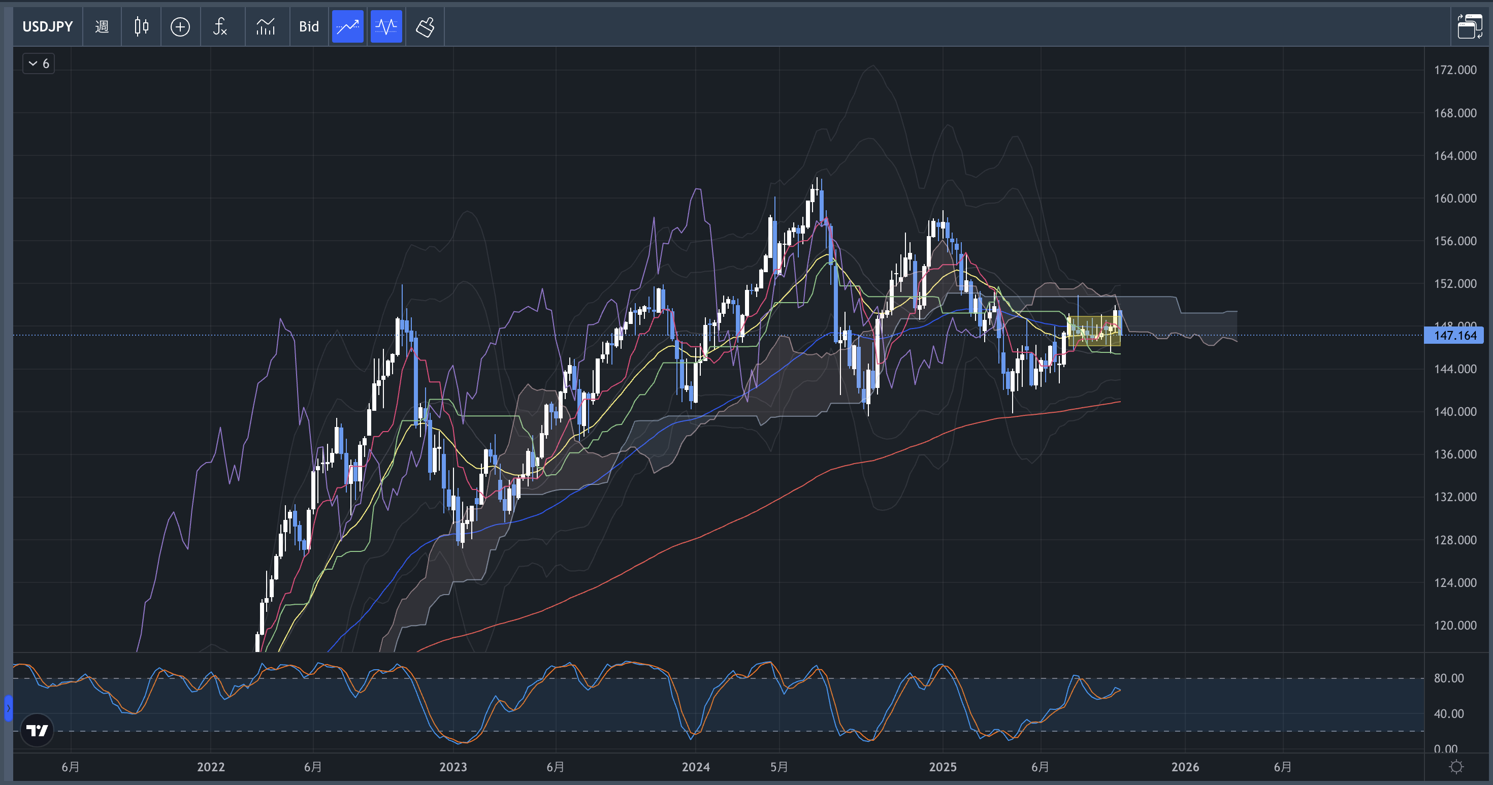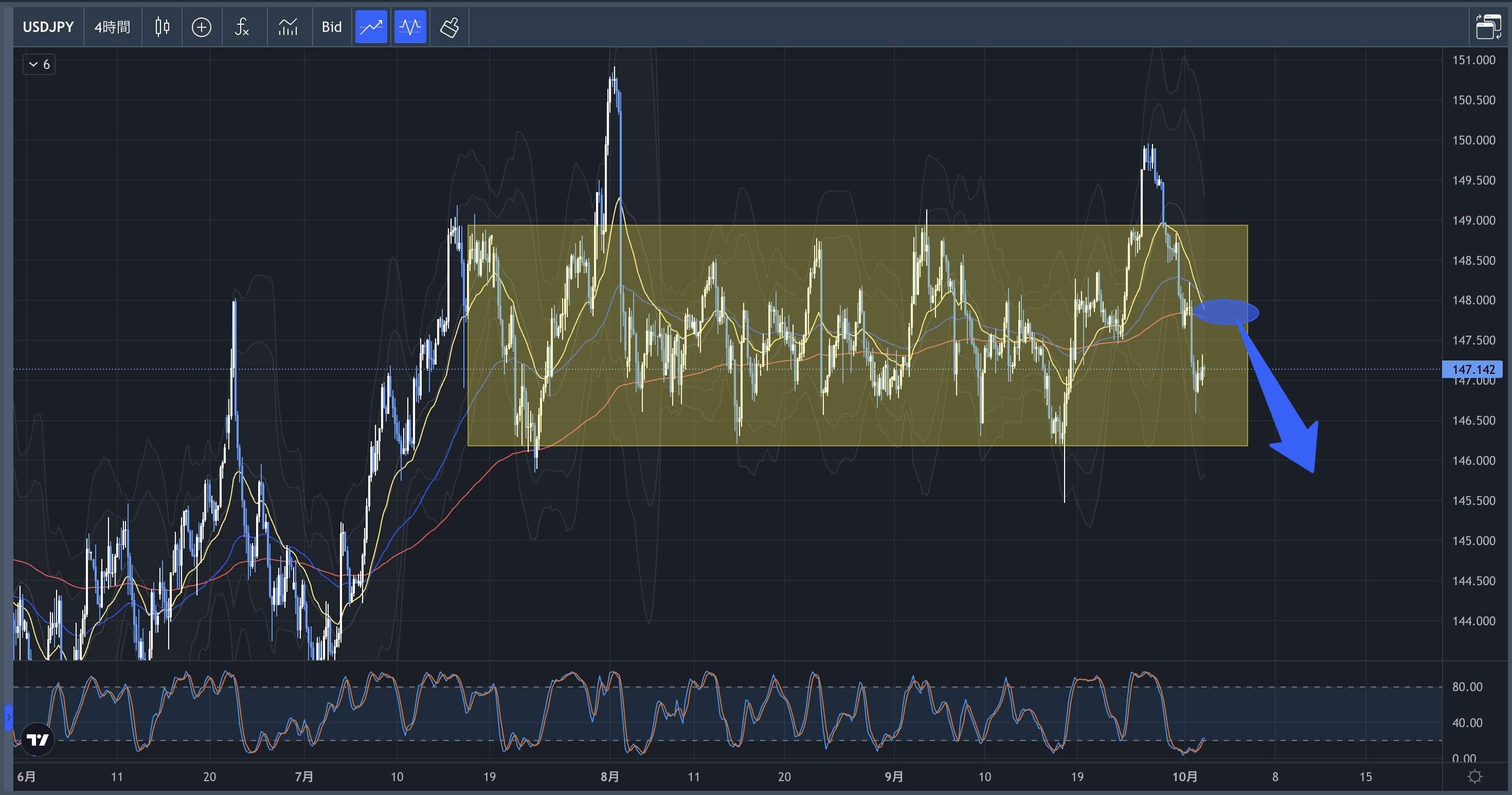 日足の雲下限がサポートとなって反発していますが、レンジ上抜けからの下降波の調整が終われば戻り売りが入ると思うので、148円付近で売ってみたいと思います。